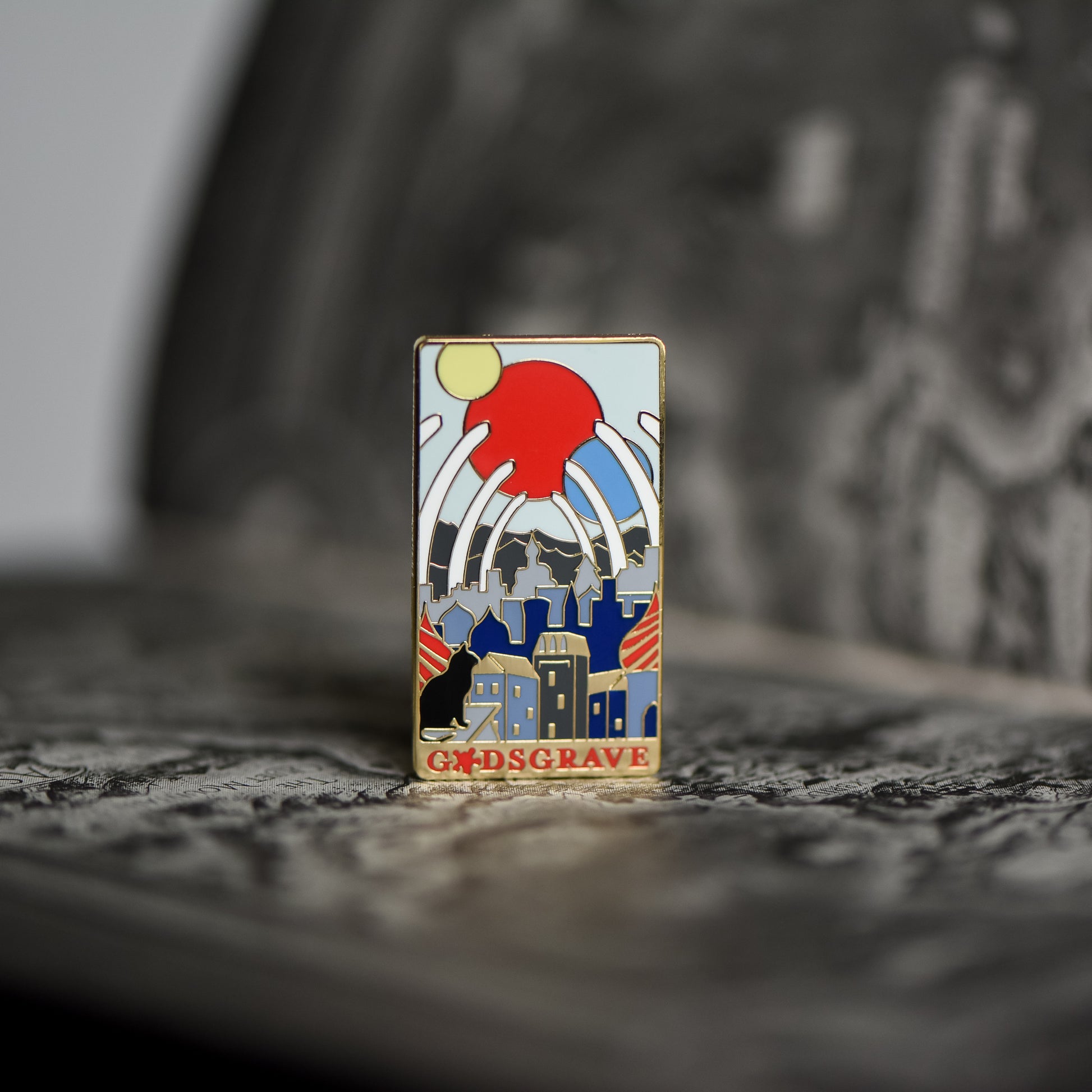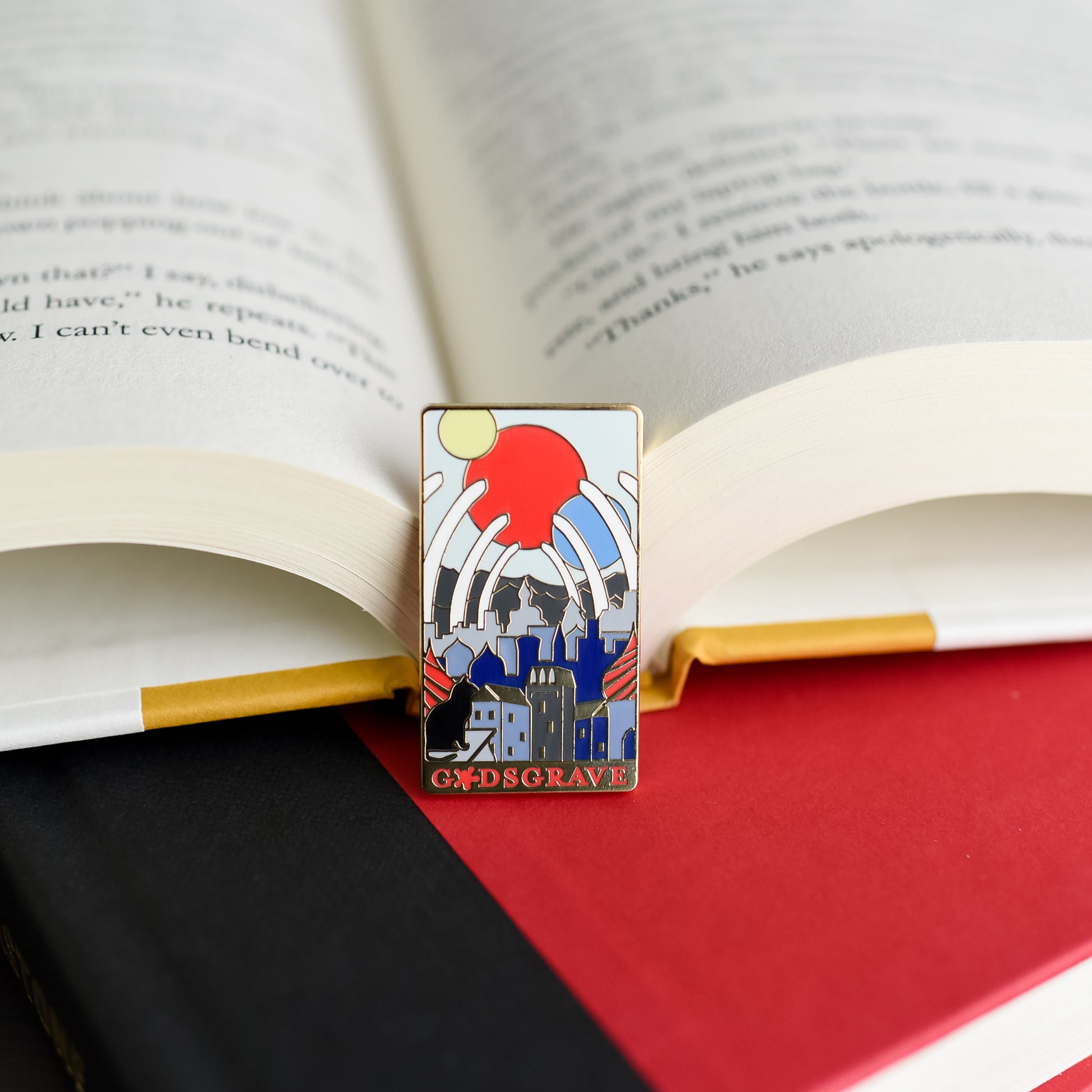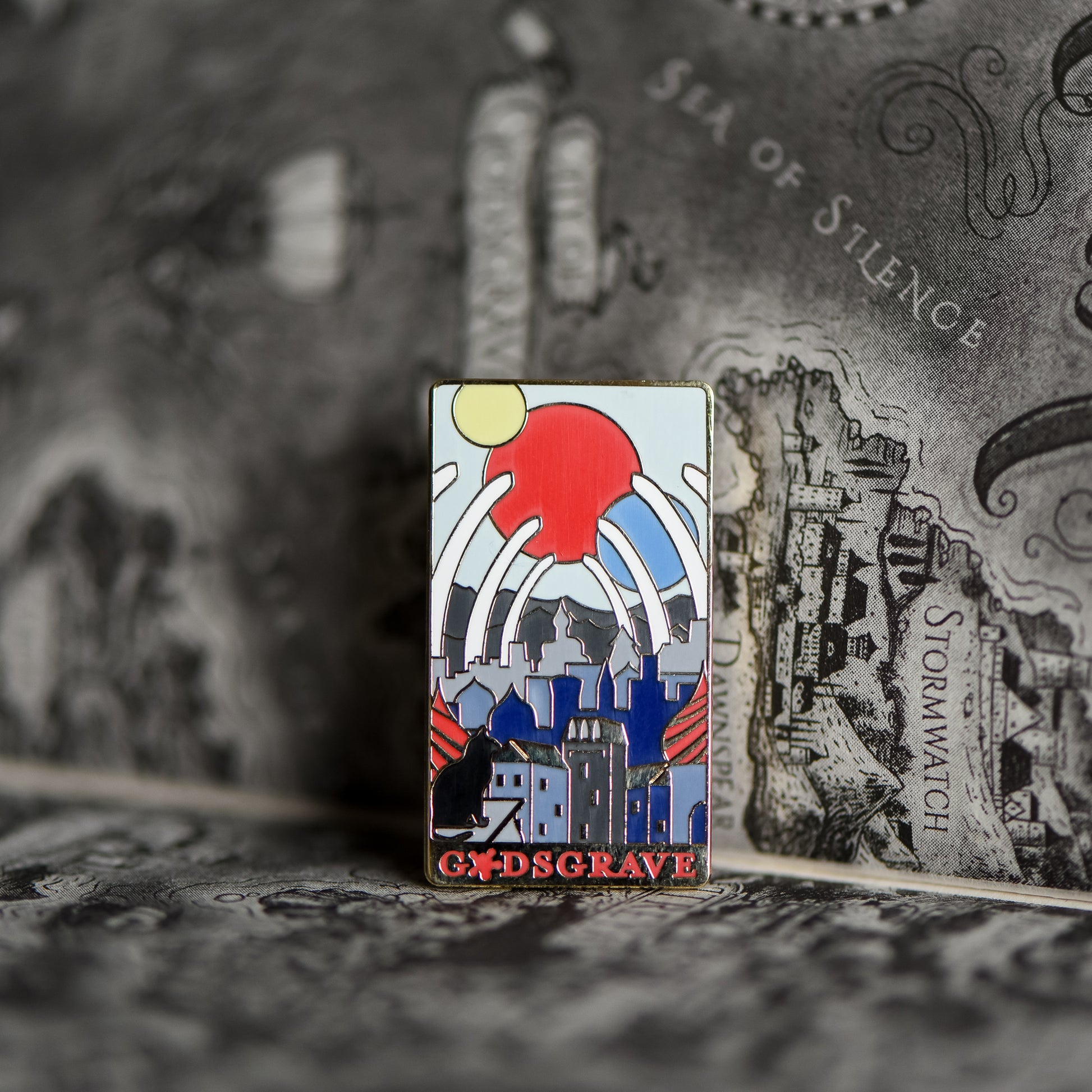 For fans of Jay Kristoff! A detailed depiction of Godsgrave from the Nevernight series, complete with giant's ribcage, three suns, and Mr. Kindly. Part of our Literary Lanscapes pin collection.