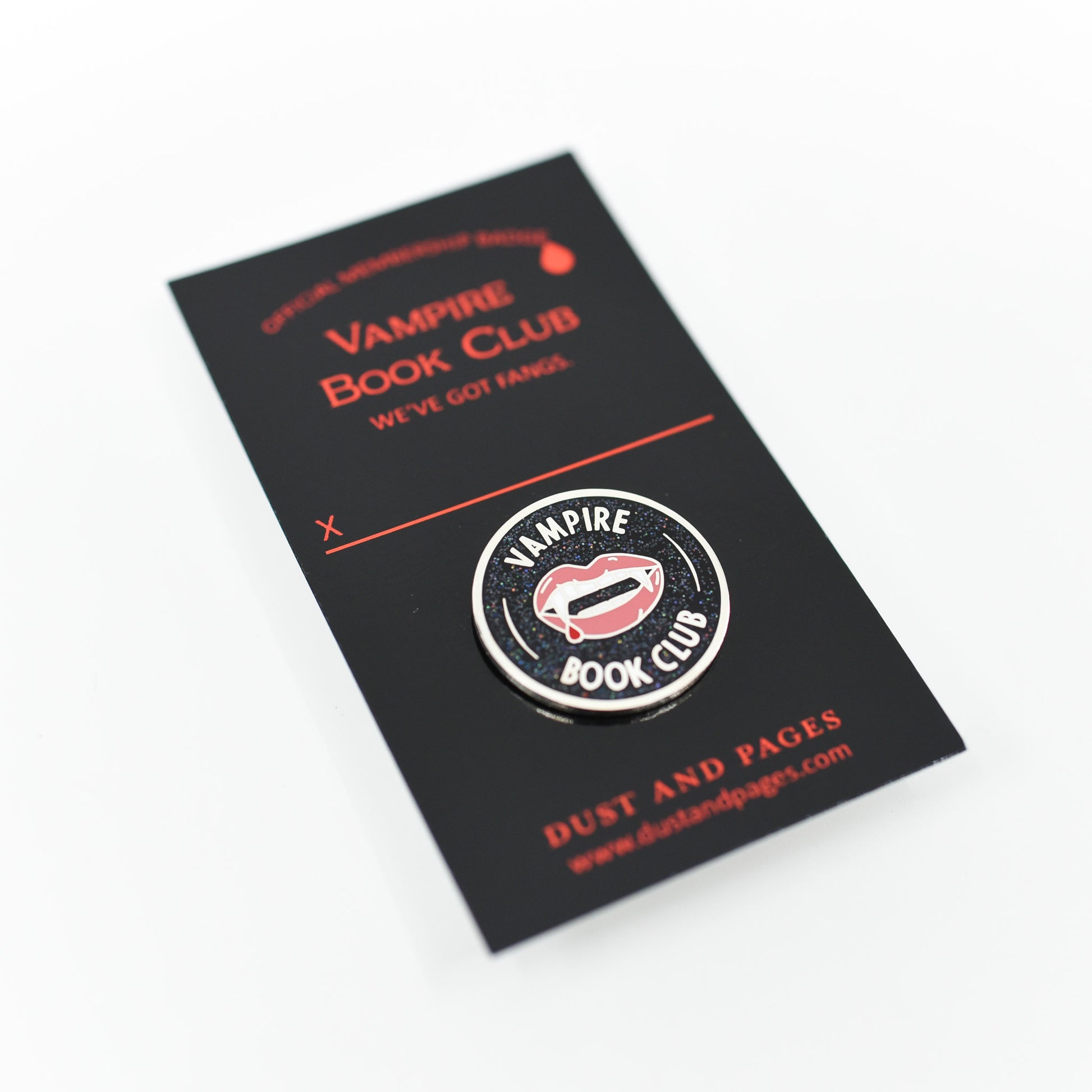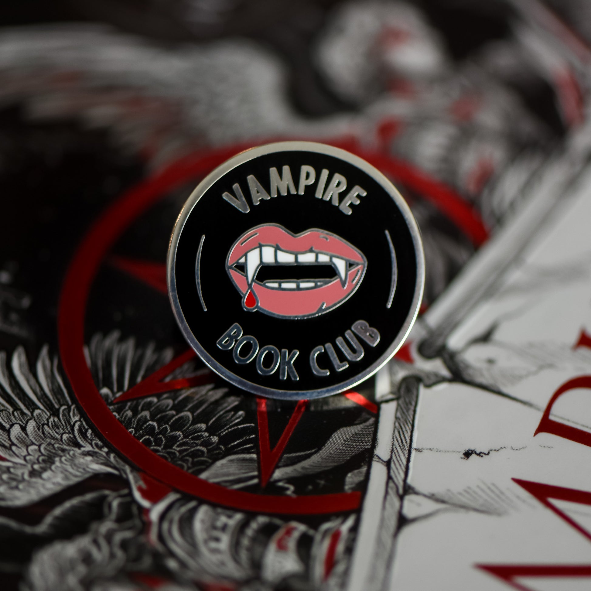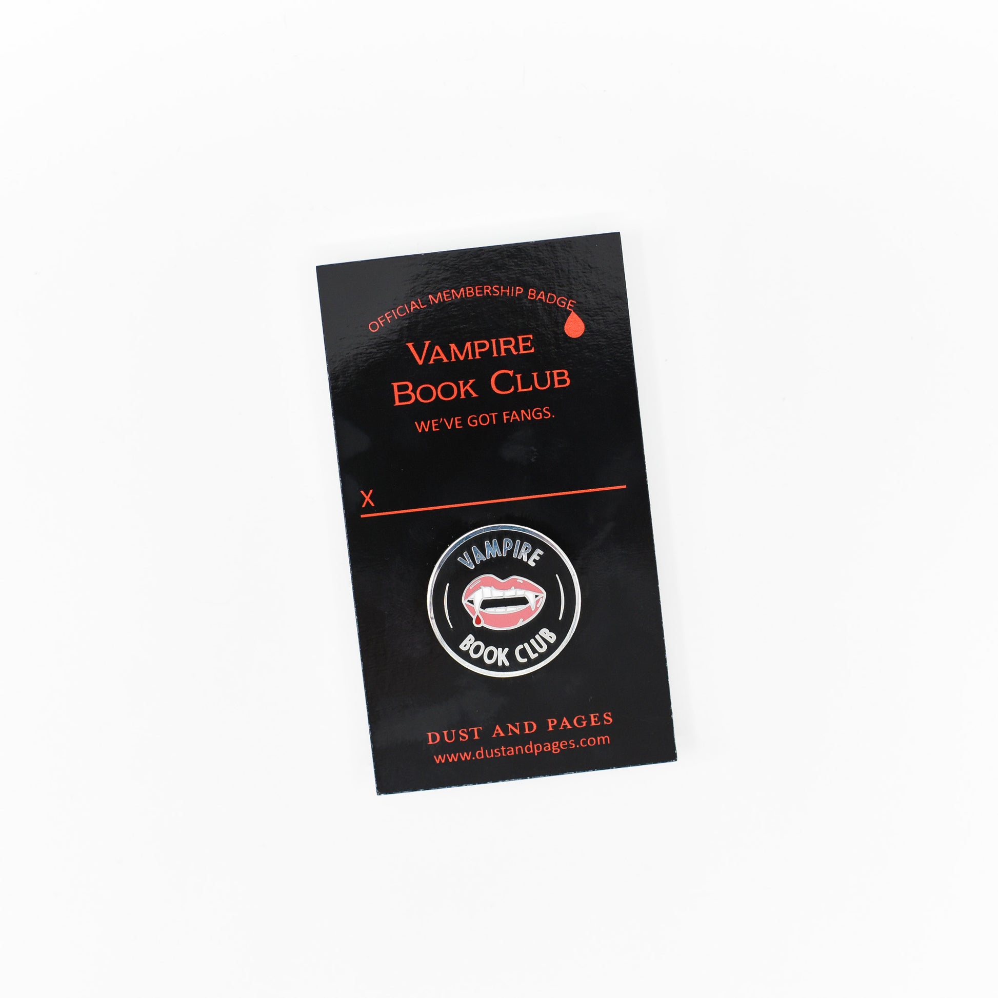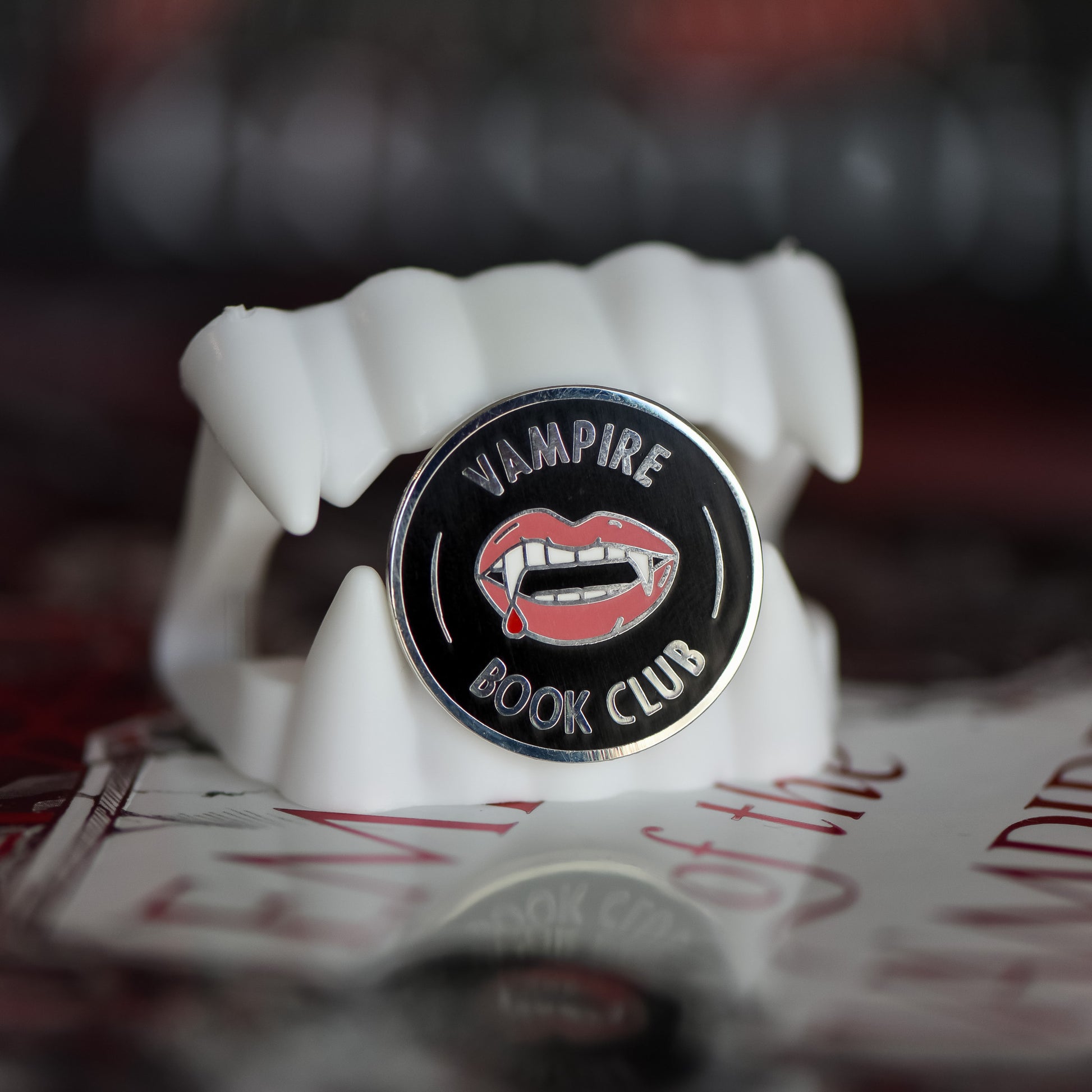 If you're a fan, we've got a pin for that! Show off your love for those toothy grins with this Vampire Book Club membership style pin. It features some blood dripping fangs on a black background.