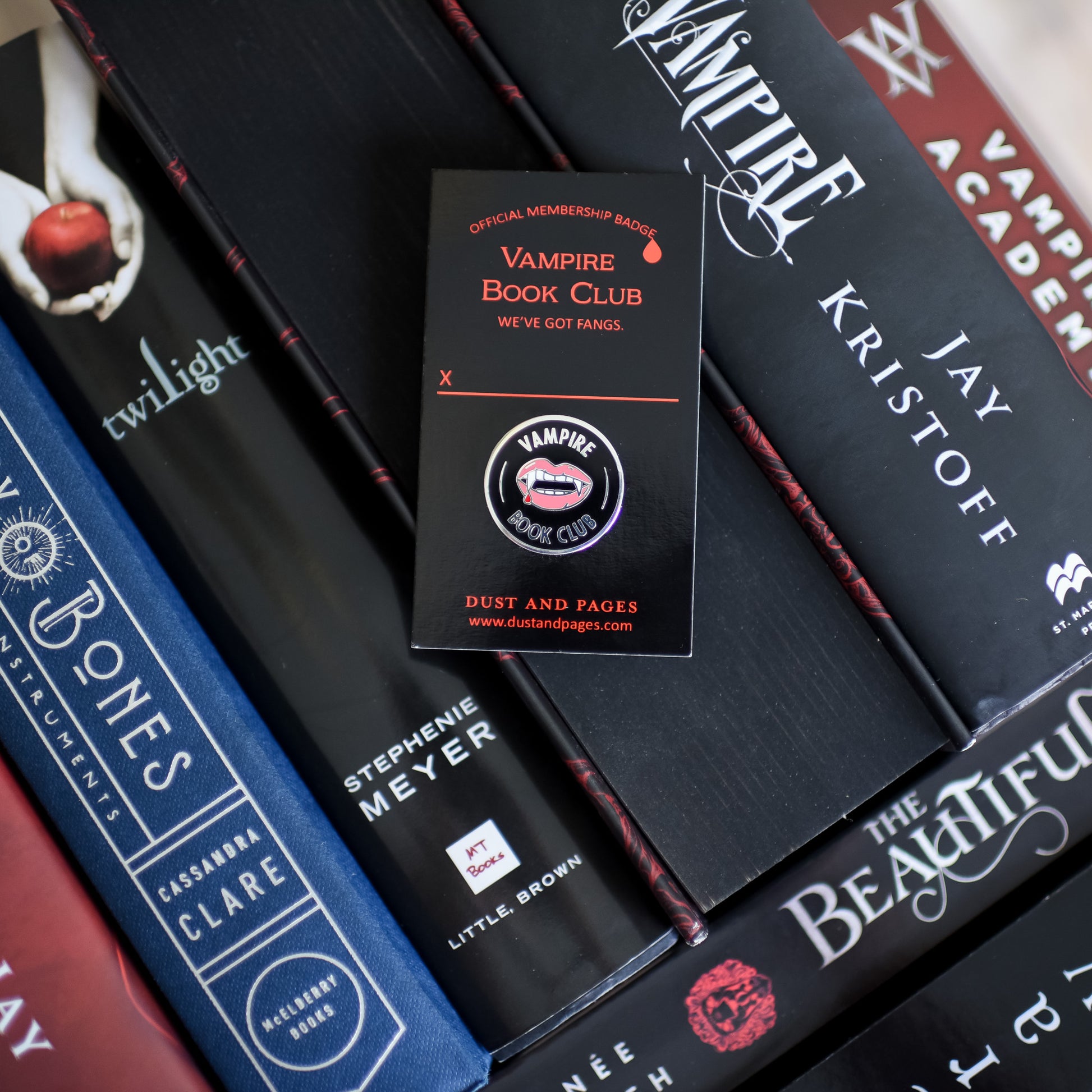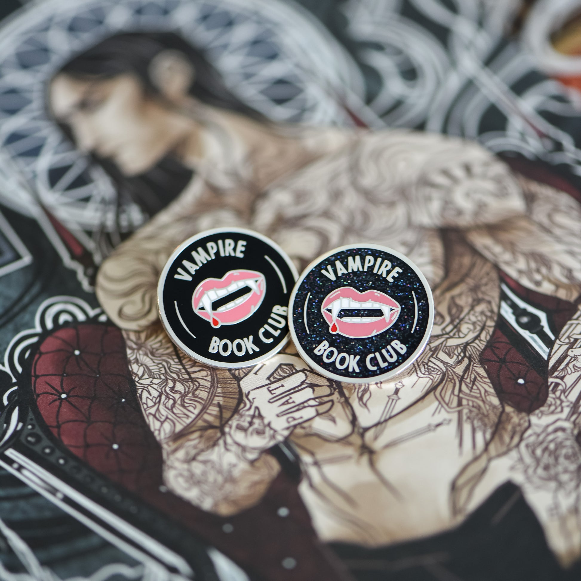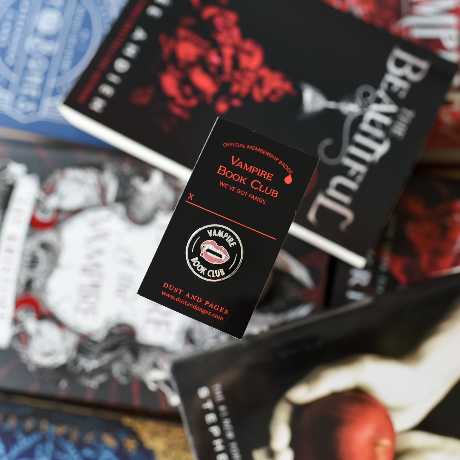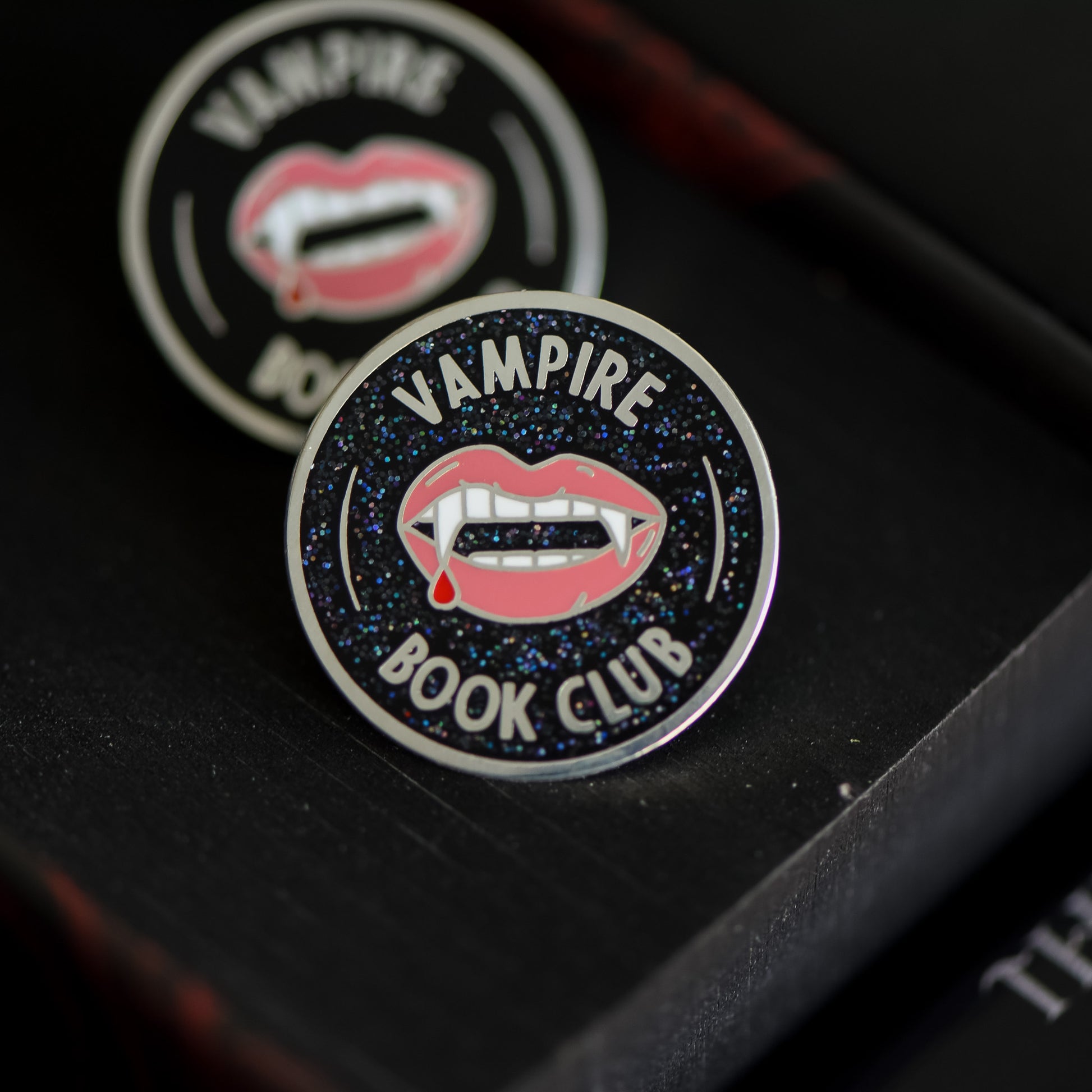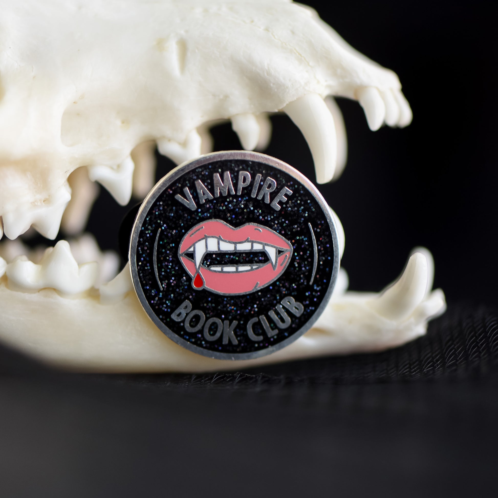 If you're a fan, we've got a pin for that! Show off your love for those toothy grins with this Vampire Book Club membership style pin. It features some blood dripping fangs on a black background.
